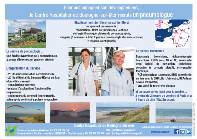 Recherche assistant-pneumologue avec évolution sur un poste de PRATICIEN HOSPITALIER dans le service de pneumologie du Centre Hospitalier Princesse Grace à Monaco Service de Pneumologie Centre Hospitalier Princesse Grace. 1, avenue Pasteur 98000, Monaco   Thèmes d’activité : Asthmologie, médecine du sommeil, cancérologie, infectiologie, pathologie interstitielle pulmonaire, insuffisance respiratoire/ VNI, fibroscopie et écho-endoscopie bronchiques. Horaires : 8h30…